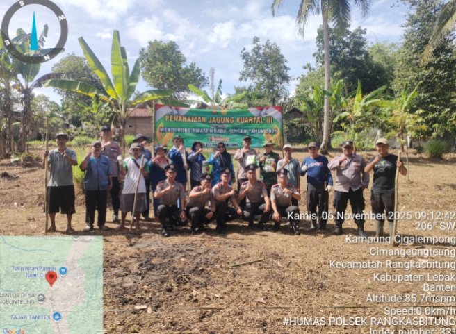 Lebak – Banten, PancaNews.com,- Dalam rangka mendukung Program Ketahanan Pangan Nasional, Polsek Rangoasbitung Polres Lebak menggelar kegiatan penanaman jagung di lahan produktif yang berlokasi di Kampung Cilukut, Desa Cimangeunteung, Kecamatan Rangkasbitung, Kabupaten Lebak, Pada Kamis.06 November 2025.