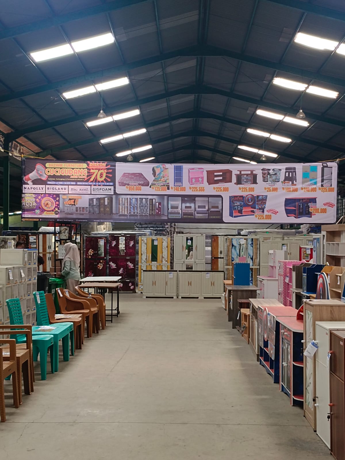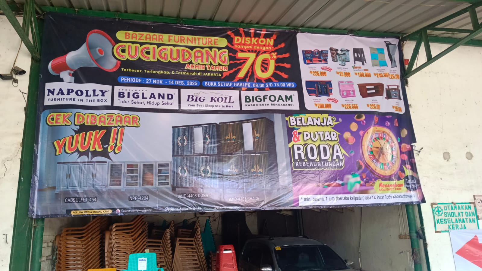 Pameran Yang berlangsung di Pergudangan Kampung Kojan Warung Gantung Kalideres Jakarta Barat Acara Pameran ini Hanya setahun sekali  di Setiap Akhir tahun Dan cuma sampai tanggal 14 Desember 2025 Promo Cuci Gudang Besar Besaran ini,
